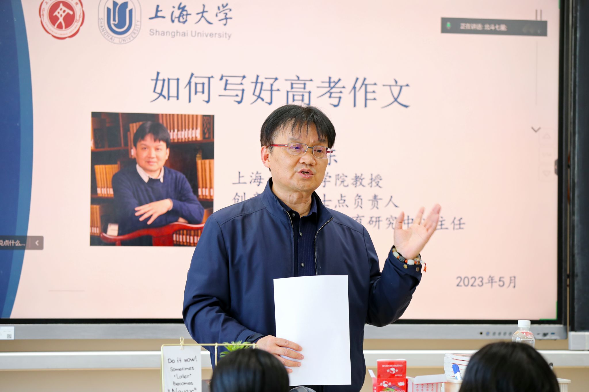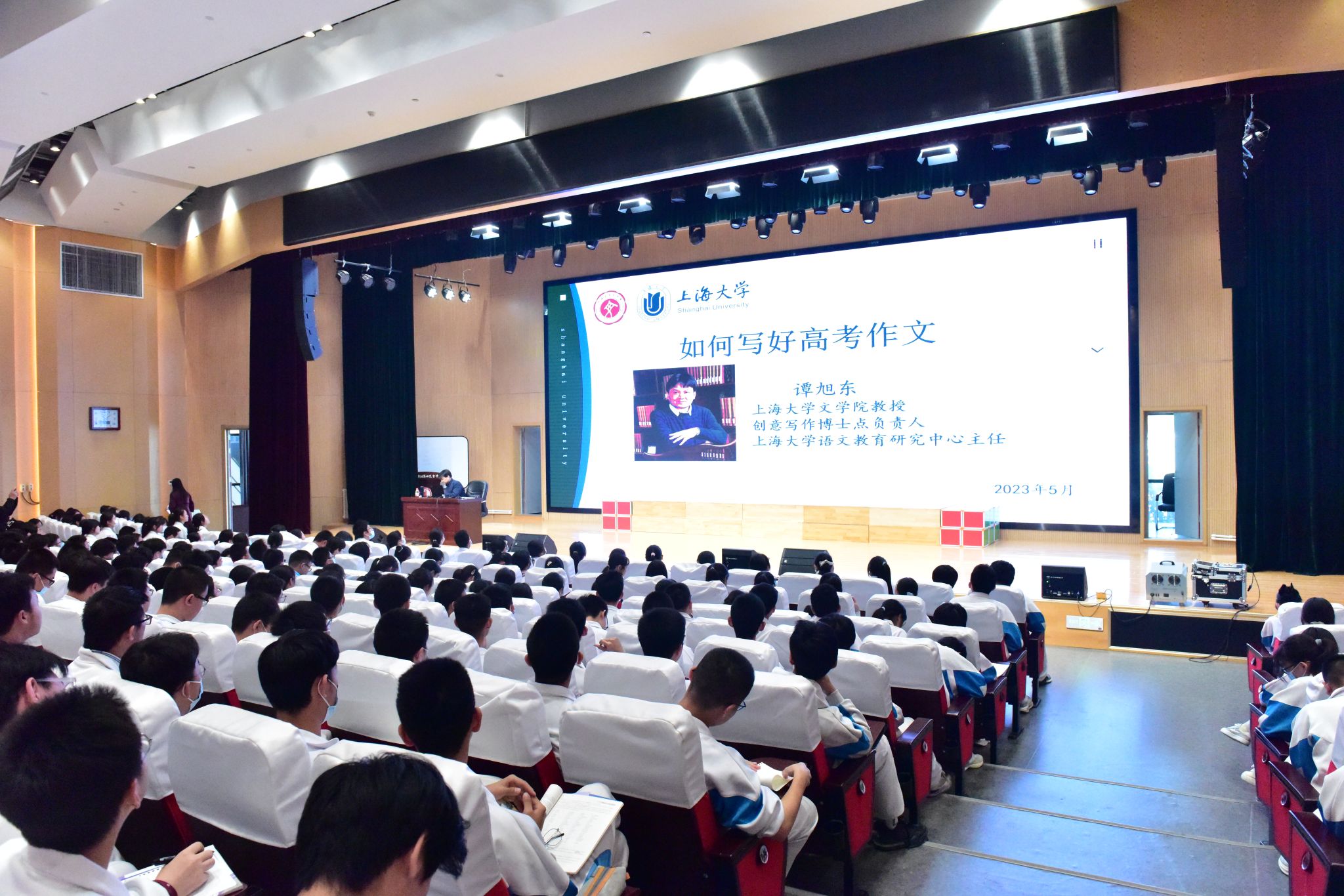 谭旭东教授围绕《如何写好高考作文》的主题,从“高考作文的重要性及其主要考察范围”、“审题与解题”、“文章结构与论证方法”、“语言:简洁行文”等多方面为高二、高三学子详细解读了如何理解与写好高考作文。谭教授紧扣高考作文的难点与重点,聚焦历年来的命题特色,为3所高中的2000余名学生带来精彩讲座,现场座无虚席、气氛热烈、互动频繁,同学们纷纷表示收获了宝贵的写作经验,开拓了行文思路,提升了审题思辨能力。