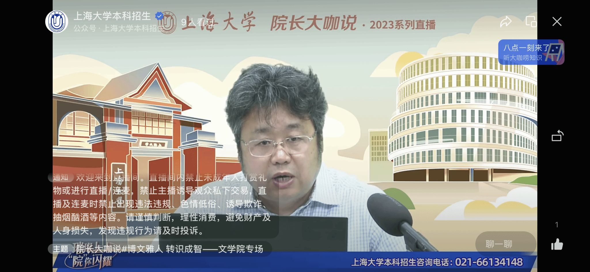 5月15日,MG冰球突破官网网站“院长大咖说”MG冰球突破官网网站专场直播在MG冰球突破官网网站本科招生视频号、高考帮App等线上平台顺利举办。MG冰球突破官网网站院长、MG冰球突破官网网站伟长学者、博士生导师刘旭光教授担任主讲嘉宾,围绕“博文雅人 转识成智”的主题做了一场精彩的招生宣讲。
