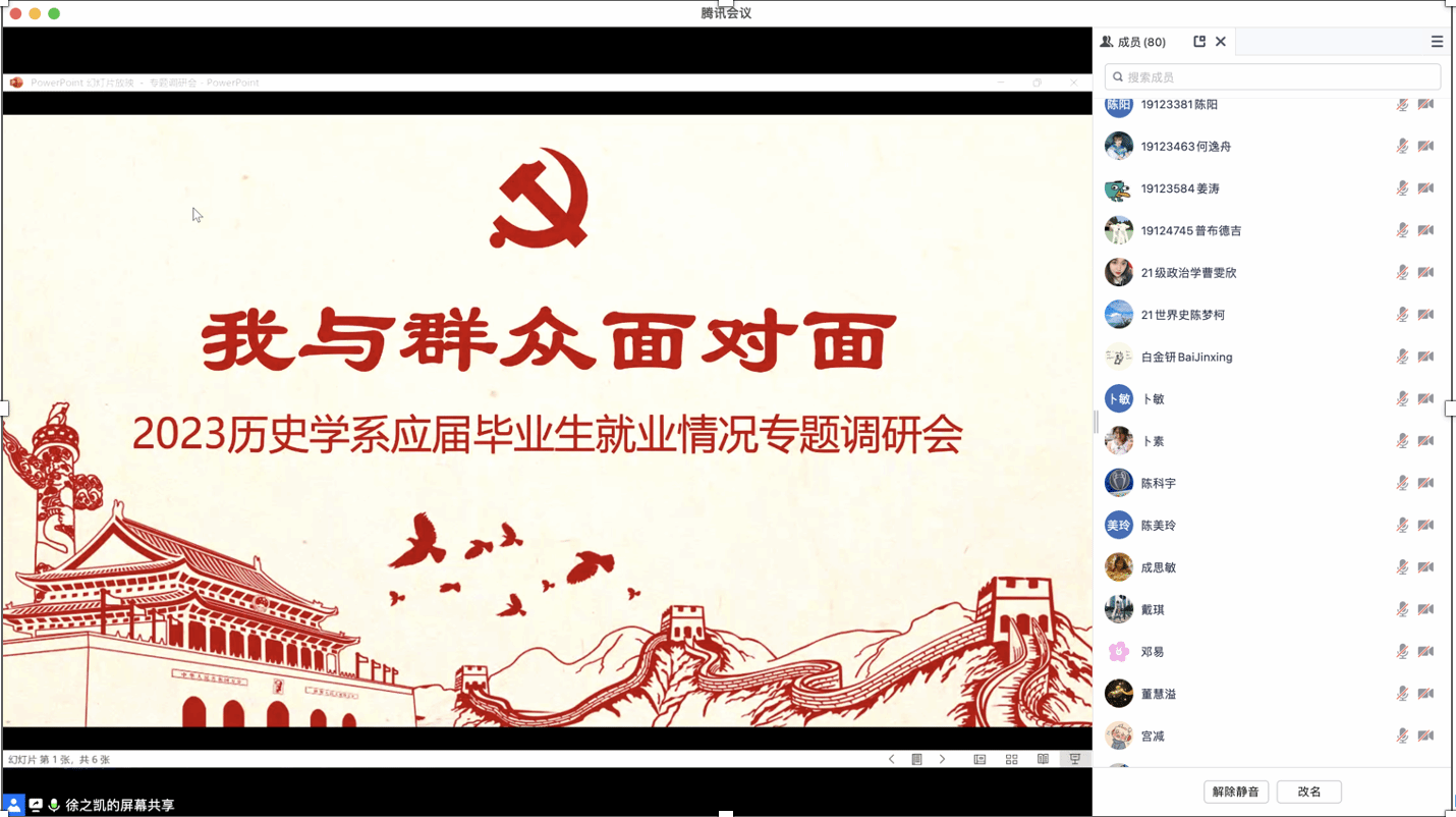 为扎实推进MG冰球突破官网网站就业工作,促进毕业生更加充分、高质量就业,5月17日下午,“我与群众面对面”2023年历史学系应届毕业生就业情况专题调研会于MG冰球突破官网网站306会议室以线上线下相结合的形式进行,旨在切实解决毕业生在就业过程中所遇、所忧的问题。MG冰球突破官网网站党委书记陆甦颖,党委副书记、副院长丁佳蒙,副院长肖清和,历史系主任郭丹彤、历史系教工党支部书记朱虹,历史系副主任舒健,历史系教授严泉,历史系教师徐之凯、黄凯,研究生辅导员宋亚丽、刘菁、卜敏,本科生辅导员张旭以及近100名MG冰球突破官网网站2023届毕业生共同参会。会议由朱虹主持。