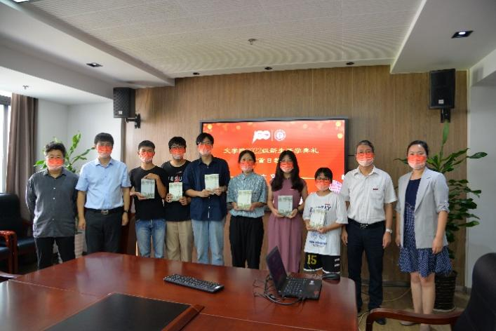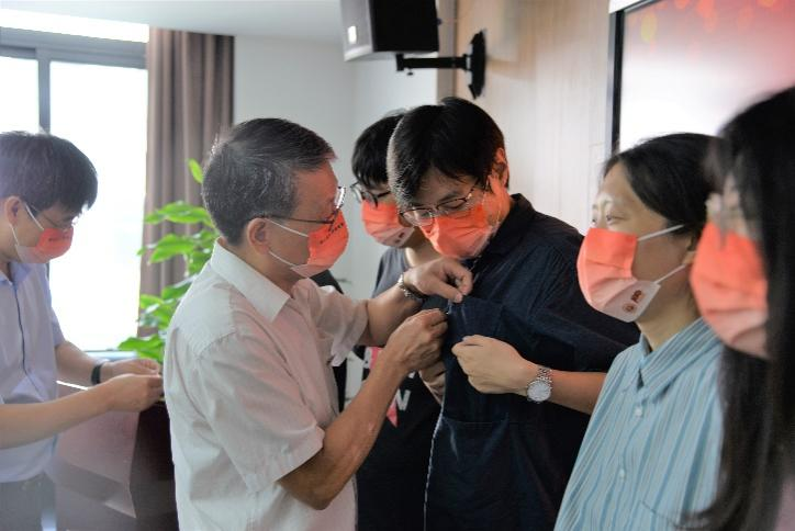 2022级新生开学典礼结束后,MG冰球突破官网网站党委书记吴仲钢,院长张勇安,党委副书记、副院长丁佳蒙、副院长刘旭光来到MG冰球突破官网网站306会议室,为线下参会的同学们佩戴院徽并赠送《MG冰球突破官网网站回忆录》。