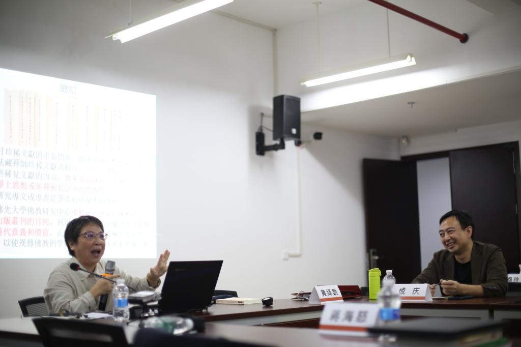 本院的成庆副教授主持了本次系列讲座的第二场主题演讲。黄绎勋教授在演讲中首先介绍了台湾佛光大学佛教研究中心近年来推动的明清禅宗文献的收集与整理项目,讲述了近年来她在中国大陆、日本以及越南等地寻觅明清禅宗文献的过程,并且重点介绍了她对汉月法藏相关文献的整理与研究过程,其中涉及到少被学界关注的明清禅宗史的大量重要议题。