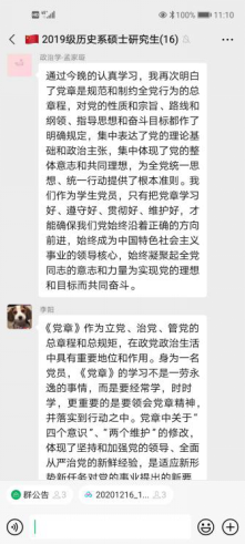 2020年12月28日,2020级历史系硕士研究生党支部线上开展“不忘初心学党章”主题党日活动。支部全体党员参与了本次会议。会议由支部书记顾钦云同志主持。学习结束后,支部的党员同志积极交流分享了自己的看法。