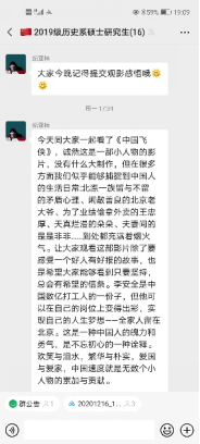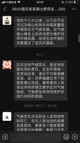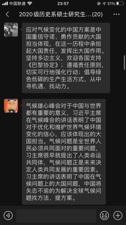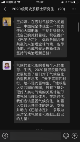 2020年12月15日,2020级历史系硕士研究生党支部全体成员通过学习强国平台集中学习了习主席在气候雄心峰会上的讲话。会议由支部书记顾钦云主持,在阅读并学习完习主席的讲话后,支部成员统一在微信群里发表了自己的感悟与心得体会。